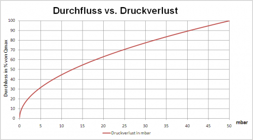 Das Diagramm gilt für Gase mit einer Dichte von Luft bei NTP (0 °C und 1013 mbar). Der Druckverlust ist stets proportional der Dichte des Gases.